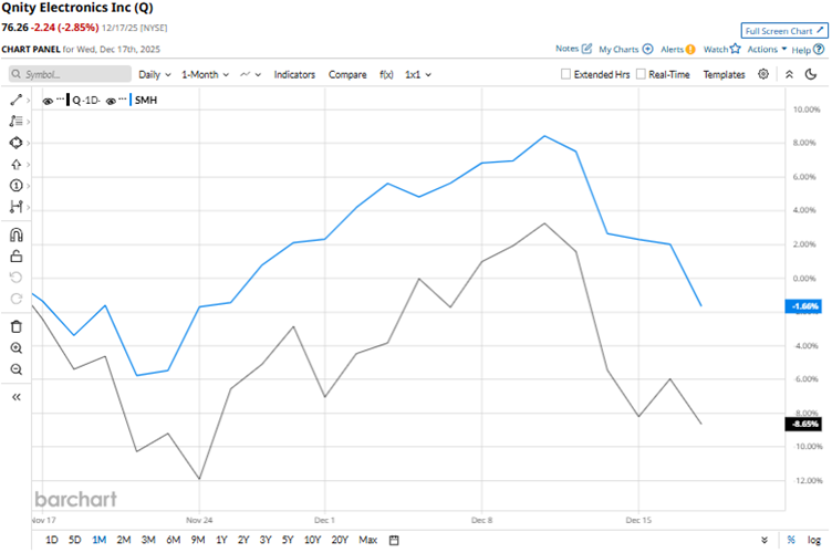 Qnity’s shares began trading last month following a spin-off from DuPont de Nemours, Inc. (DD). It reached a one-month high of $87.95 on Dec. 10, but is down 13.3% from that level. Following its launch, the stock has not performed well on Wall Street. Over the past month, it has dropped 6.4%. On the other hand, VanEck Semiconductor ETF (SMH) is only down marginally over the past month.