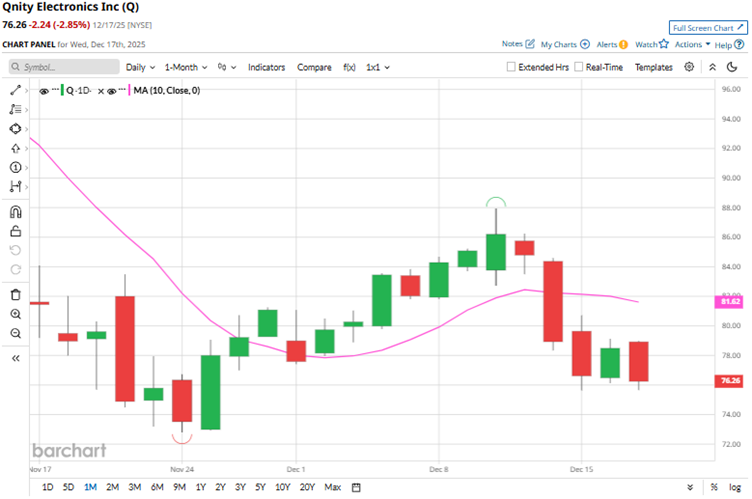 Qnity’s stock has stayed below its 10-day moving average since Dec. 12, underscoring persistent near-term bearish momentum. The weakness has accelerated in recent sessions, with shares dropping 11.5% over the past five trading days, once again underperforming the broader semiconductor sector, as the VanEck Semiconductor ETF declined a more modest 9.3% over the same period.