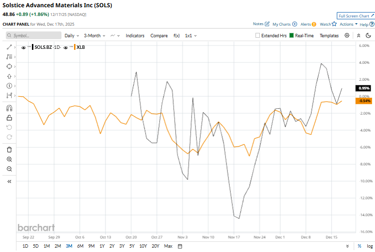 Solstice made a strong first impression on the public markets, hitting its all-time high of $61 on its very first trading day on Oct. 20. Momentum has only strengthened since then, with the stock rallying 17.5% over the past month, comfortably outperforming the Materials Select Sector SPDR Fund's (XLB) 5.8% rise during the same period.