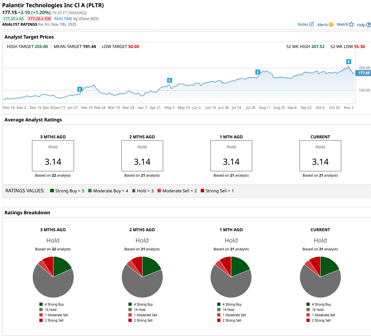 Wall Street remains skeptical of PLTR stock due to its sky-high valuation and rates it an overall “Hold.” Among the 21 analysts that cover the stock, four rate it a “Strong Buy,” 14 say it is a “Hold,” one rates it a “Moderate Sell,” and two say it is a “Strong Sell.” Its average target price of $191.44 suggests the stock can climb by 12% from current levels. Plus, its Street-high estimate of $255 implies the stock has upside potential of about 50% over the next 12 months.