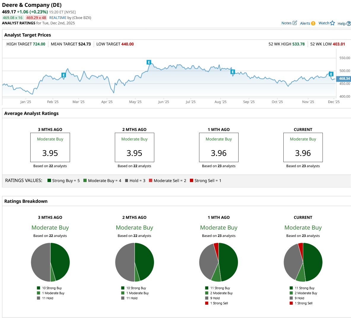 Analysts are very optimistic about DE’s future, and the 23 surveyed arrive at a consensus “Moderate Buy” rating. The average price target sits around $523.9, implying roughly 12.8% upside from here before any dividends.
