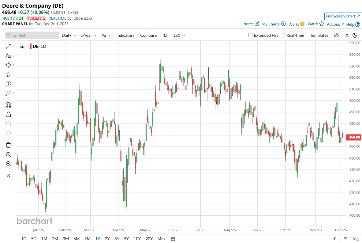 Deere & Company (DE) sits squarely in the path of that storm. It just posted Q3 earnings of $3.93 per share on revenue of roughly $12.4 billion, beating sales expectations. Yet shares still dropped more than 5% after management flagged a $1.2 billion pre-tax tariff hit for fiscal 2026, nearly double this year's impact. Is this a quality name on sale or an early sign of deeper trouble ahead? Let's dive in.