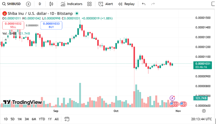 The Shiba Inu token is priced at $0.00001032, 1.25% higher on a 24-hour basis, with a market capitalization of $6.09 billion. Volume traded rose 43.48% to $202.55 million, suggesting new short-term buying interest. SHIB price bounce aligns with a larger rotation towards meme-based tokens after recent volatility in large-cap tokens.