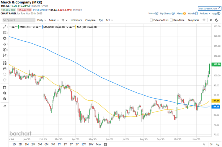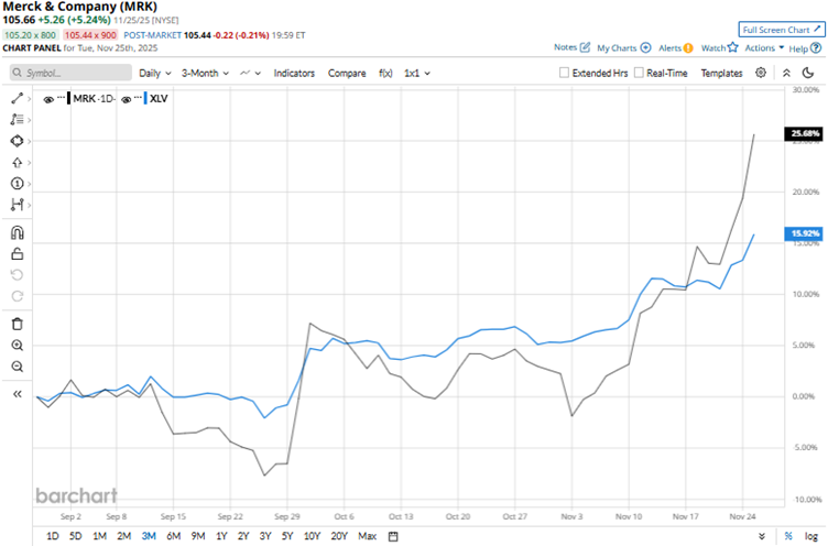 Merck’s stock reached a 52-week high of $105.84 on Nov. 25, after Wells Fargo analyst Mohit Bansa raised the company’s rating to “Overweight,” seeing a future beyond its flagship drug Keytruda, and is down only marginally from that level. Over the past three months, Merck’s stock has gained 23.9%. On the other hand, the Health Care Select Sector SPDR Fund (XLV) has gained 16.6% over the same period. Therefore, Merck has outperformed its peers in the sector.