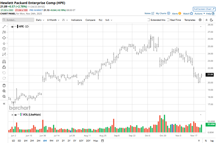 HPE stock is up nearly 80% from its tariff-induced April lows. However, over the last year, it has had a rather disappointing performance of -4%. Well below the S&P 500 Index’s ($SPX) 12% returns. DELL, on the other hand, has given an even worse performance of -12.7% in the last 12 months.