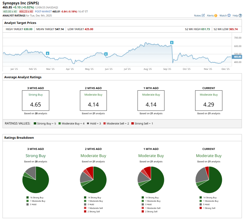 Of the 21 analysts who cover SNPS stock, 14 have a “Strong Buy” rating, and one has a “Moderate Buy” rating. The mean price target on the shares is $547.14. Analysts' mean earnings estimate calls for the firm's earnings per share to jump to $9.15 in fiscal 2026, up from $7.98 in fiscal year 2025.