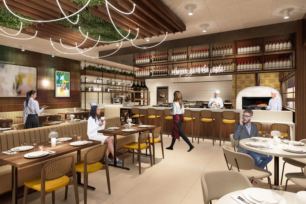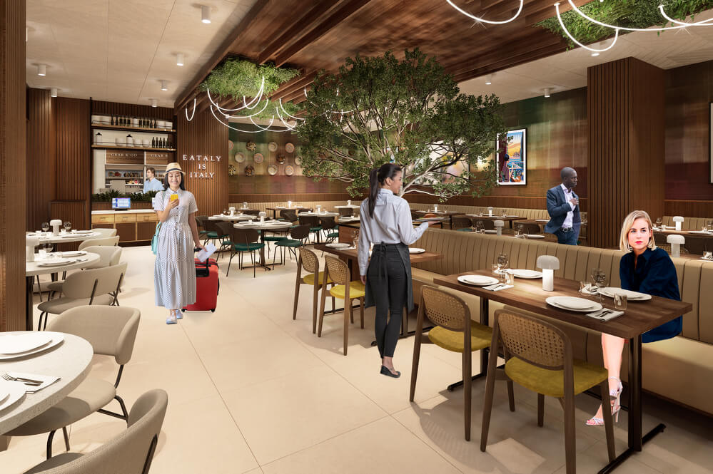 The familiar space will blend gleaming quartz countertops, hand-crafted ceramic tiles, and textured woods paired with warm metal accents, all bathed in natural light and softened with Eataly’s signature greenery and olive trees. Every detail—from custom banquettes and artful planter boxes to artisanal pizza ovens and bespoke lighting—has been carefully curated to transport travelers to Italy, even while en route to their next destination.
