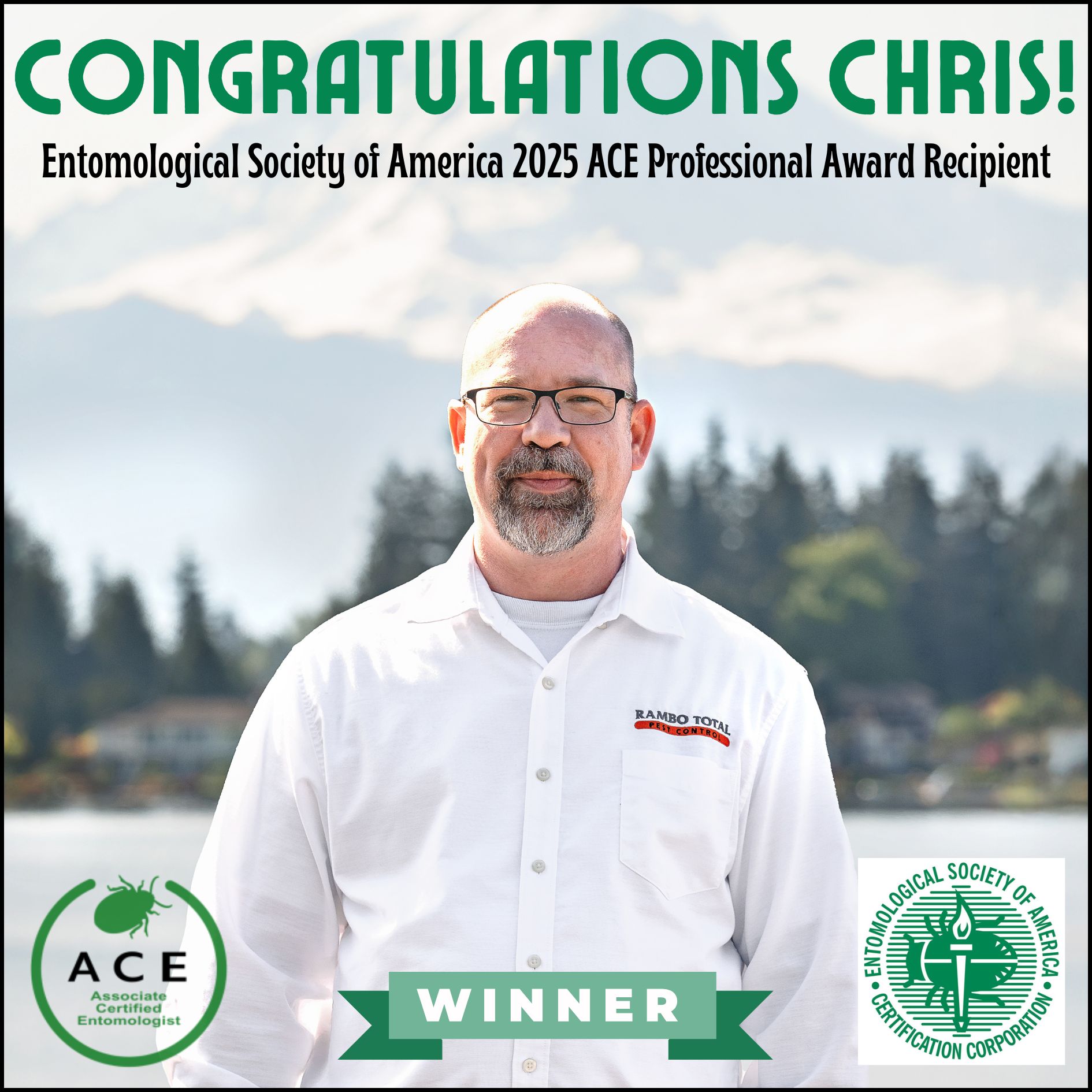 Puyallup, WA - Rambo Total Pest Control proudly announces that Christopher Somers earns ACE Professional Award, a national recognition presented by the Entomological Society of America for excellence in structural pest management. This national recognition honors an outstanding Associate Certified Entomologist (ACE) who demonstrates exceptional contributions to the field of structural pest management and serves as a leader within the industry.