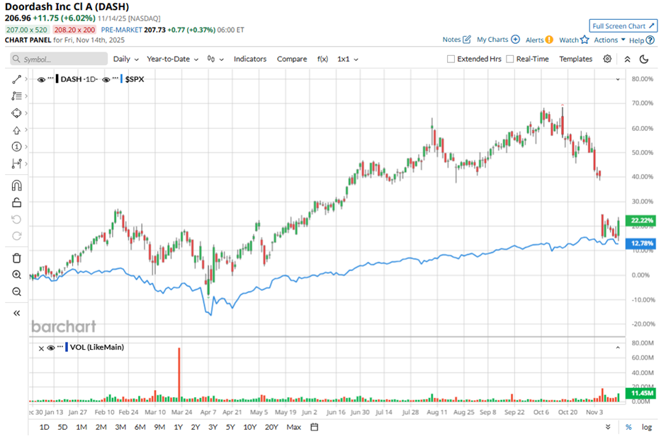DASH stock hasn’t been a stranger to volatility since then, and the recent pullback hasn’t helped. Even so, DoorDash remains in positive territory this year, with shares up about 12% in 2025, edging out the broader S&P 500 Index’s ($SPX) softer gain of 11% during the same stretch.