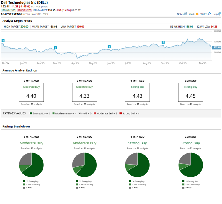 Dell has been in the spotlight on Wall Street for some time now, with analysts awarding it a consensus “Moderate Buy” rating overall. Of the 22 analysts rating the stock, a majority of 14 analysts have a “Strong Buy,” two analysts suggest a “Moderate Buy,” and six analysts play it safe with a “Hold” rating. The consensus price target of $164.50 represents 40% potential upside from current levels. The Street-high price target of $200 indicates potential upside of 70% from here.