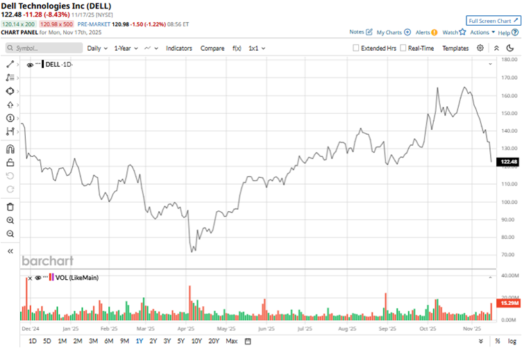 DELL stock has been turbulent on Wall Street for some time. Over the past 52 weeks, the stock has declined by 12%, while over the past six months it has increased by 3%. Dell’s stock reached a 52-week high of $168.08 in early November, but after recent downgrades, it has lost 12% over the past five days and is now down 30% from its 52-week high.