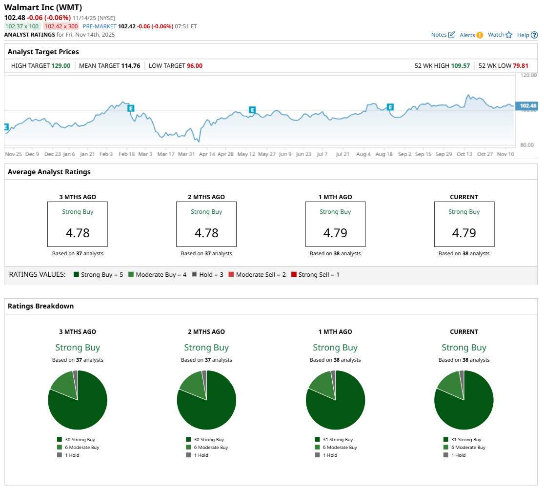 The average price target for WMT sits at $114.76, suggesting potential upside of 7%. Meanwhile, the Street-high target of $129 represents a potential gain of 20% from current price levels, underscoring long-term confidence in Walmart’s evolving strategy and expanding digital ecosystem.