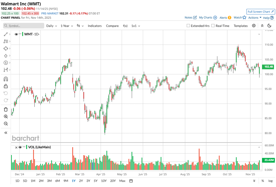 The company also has a legacy as a Dividend Aristocrat with 51 consecutive years of dividend increases. Walmart pays an annual dividend of $0.94 and delivers a yield of 0.91%. The next dividend payment is scheduled for Jan. 5, 2026, for shareholders on record as of Dec. 12, 2025.