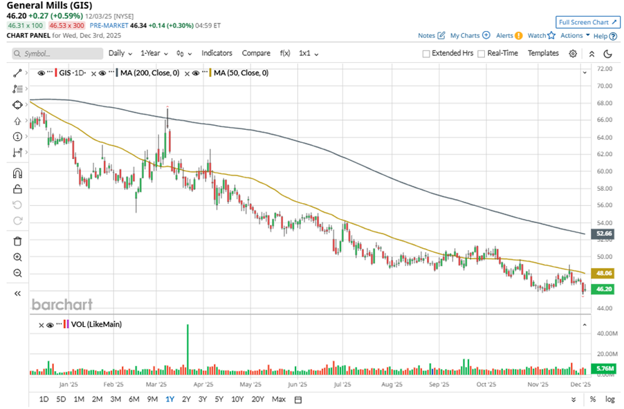 To confirm the bearish trend, GIS has been consistently trading below its 50-day and 200-day moving averages over the past year, with slight fluctuations.