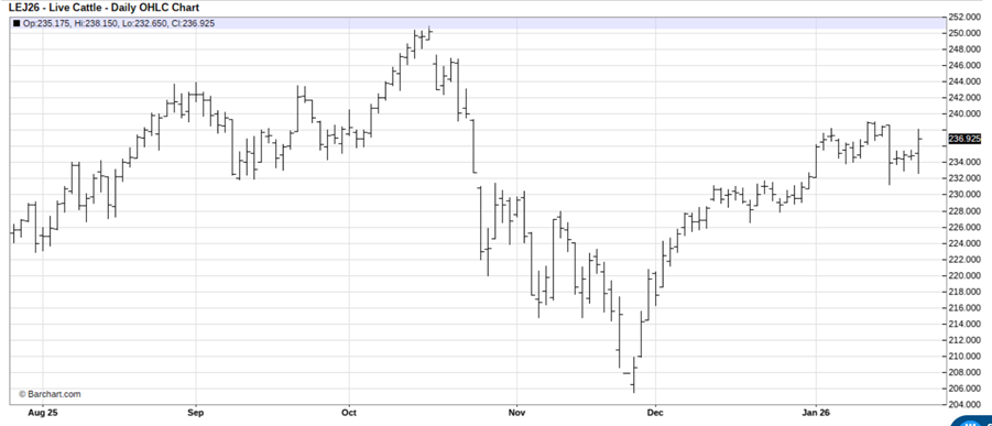 April live cattle (LEJ26) futures present a buying opportunity on more price strength.