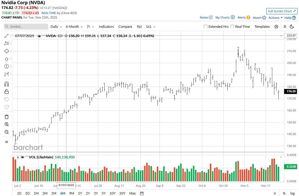 Following today’s decline, Nvidia shares are down about 18% versus their year-to-date high set in late October.