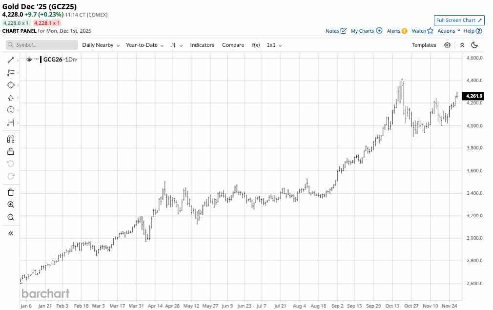 As the daily year-to-date continuous contract chart highlights, gold’s price fell 11.3% from the October 20 high of $4,398 to the October 28 low of $3,901.30. Gold was trading above $4,200 in early December, with the midpoint of the recent high and low at $4,150 per ounce.
