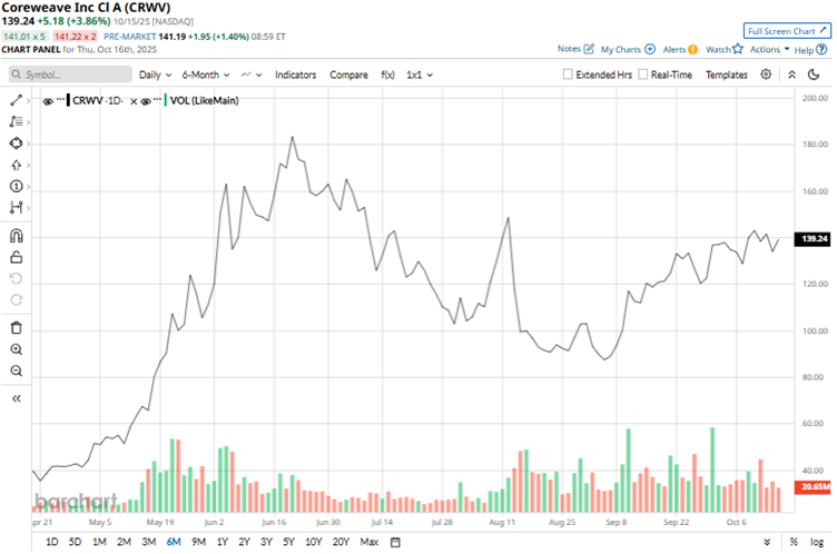 Over the past six months, CRWV stock has held up well, gaining 124%. However, its stock performance has been volatile. Over the past month, the stock is down 15%. Still, CoreWeave has benefited from continued demand for AI infrastructure services and bullish analyst sentiments.