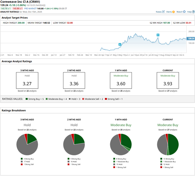 CoreWeave has come into the limelight on Wall Street, with analysts awarding it a consensus “Moderate Buy” rating overall. Of the 27 analysts rating the stock, 13 analysts rate it a “Strong Buy,” one analyst suggests a “Moderate Buy,” 12 analysts play it safe with a “Hold” rating, and one analyst gives a “Strong Sell” rating. The consensus price target of $141.84 represents potential upside of 24% from current levels. Meanwhile, the Street-high price target of $200 indicates potential upside of 75%.
