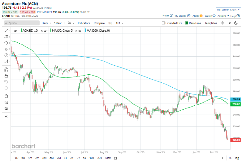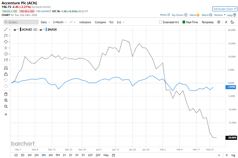 Shares of the company have fallen 46.2% from its 52-week high of $365.58. Accenture’s shares have declined 19.3% over the past three months, lagging behind the Nasdaq Composite’s ($NASX) marginal fall during the same period.