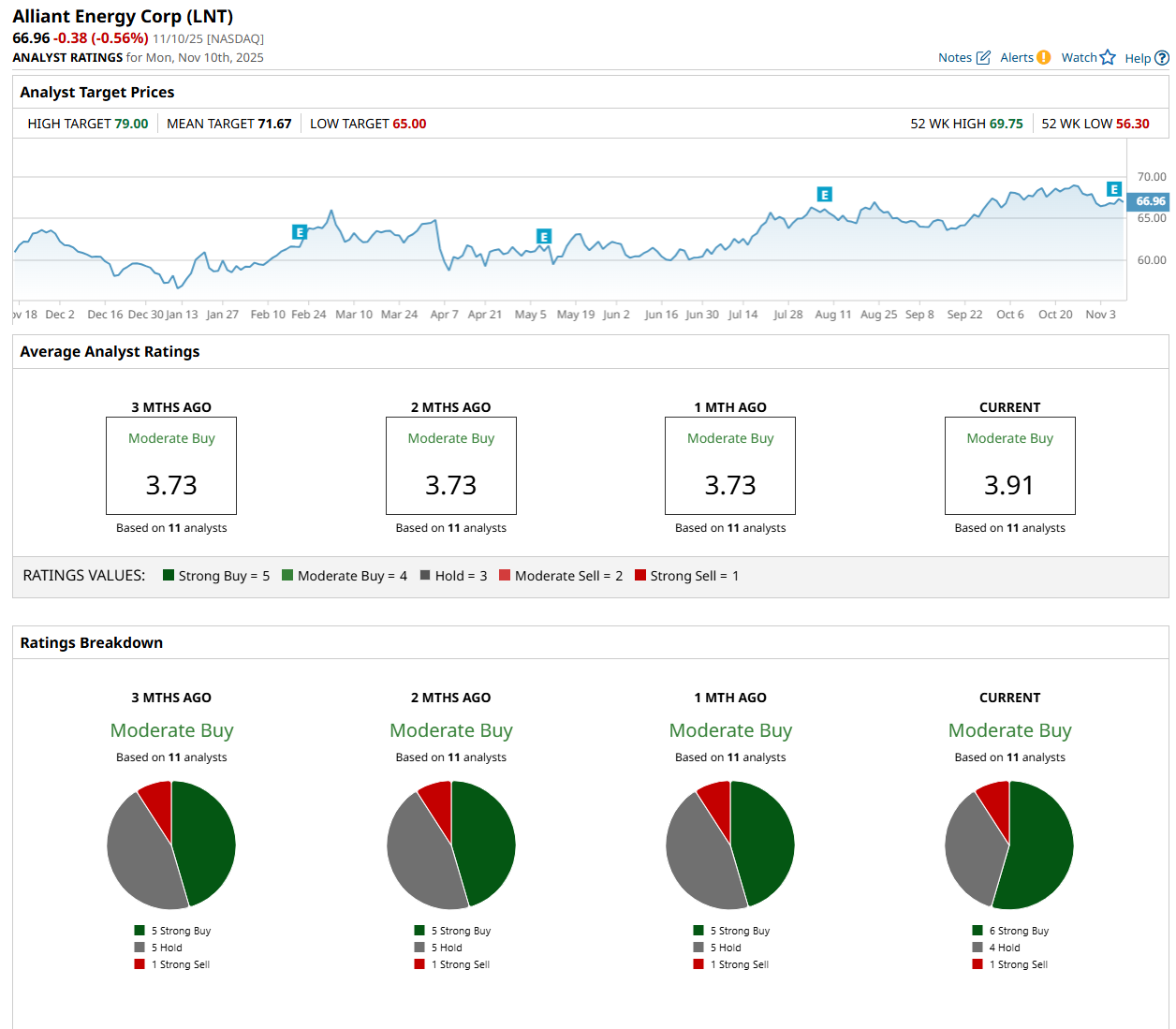 On Nov. 10, The Bank of Nova Scotia (BNS) analyst Andrew Weisel maintained a "Hold" rating on LNT and set a price target of $67, indicating a marginal potential upside from the current levels.