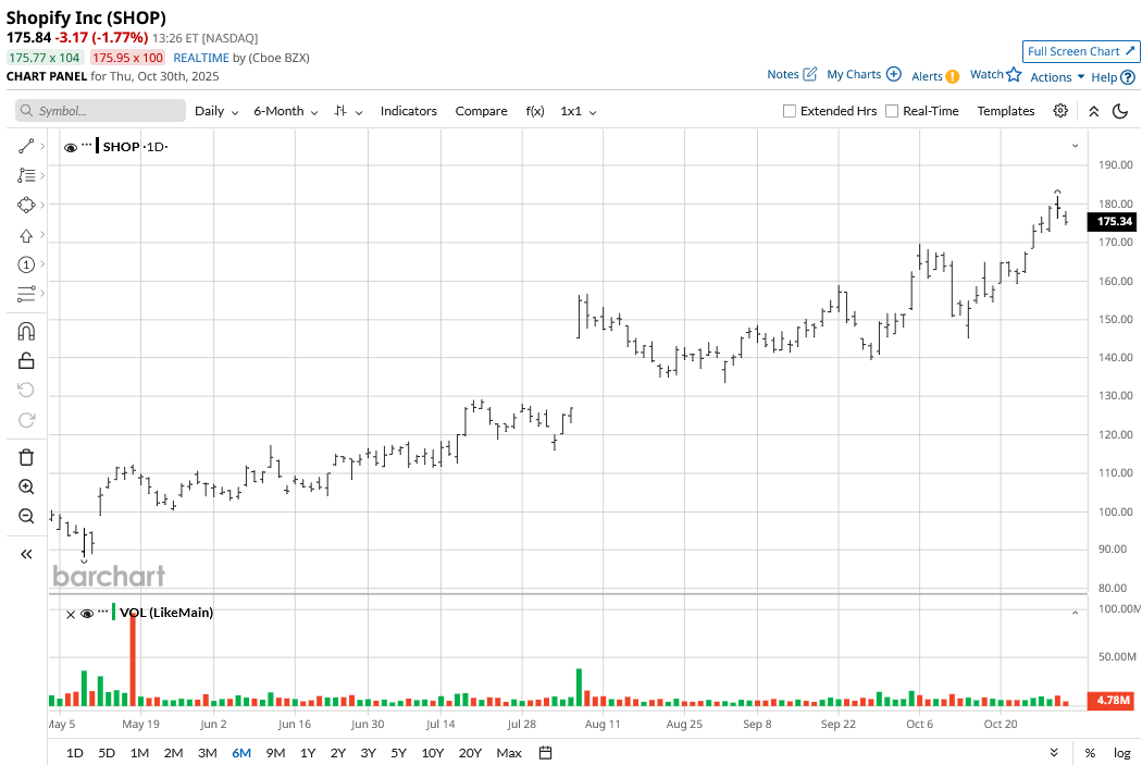SHOP stock has reached its all-time high, currently trading around $177. So far in 2025, the scrip has delivered above 65% return and has outperformed the benchmark Nasdaq Composite’s ($NASX) year-to-date (YTD) returns of 24% by a comprehensive 2.9x multiple. Driven by strong growth in the e-commerce segment and robust double-digit growth during the second quarter, the stock is up 236% from its 2025 low of $76.89 that it touched back in April. The company’s expanding Gross Merchandise Volume (GMV), which stood at $292.275 billion in 2024, is paving the way for such an accelerated bullish trend. Its partnership with OpenAI to deliver a more seamless consumer experience through instant checkouts in ChatGPT has also been a catalyst in recent weeks.