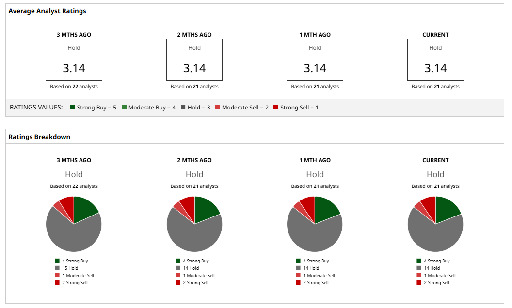 As of now, the consensus rating hovers at a “Hold.” Among the 21 analysts tracking PLTR, four label it a “Strong Buy,” 14 suggest “Hold,” one advises “Moderate Sell,” and two call for a “Strong Sell.” The stock trades 13% below its average price target of $191.44.