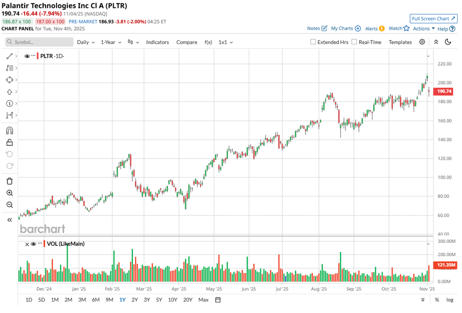 On Nov. 3, just a day before the selloff, PLTR shares climbed 3.4% to hit a fresh 52-week high of $207.52. The rise came on the day the company unveiled its fiscal 2025 Q3 earnings. Revenue surged 62.8% year-over-year (YOY) to $1.18 billion, breezing past analyst estimates of $1.09 billion.