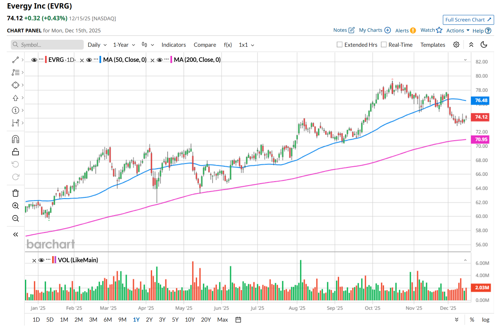To confirm its bullish trend, EVRG has been trading above its 200-day moving average over the past year. However, it has remained below its 50-day moving average since late November.