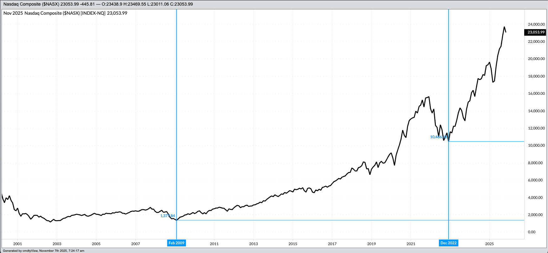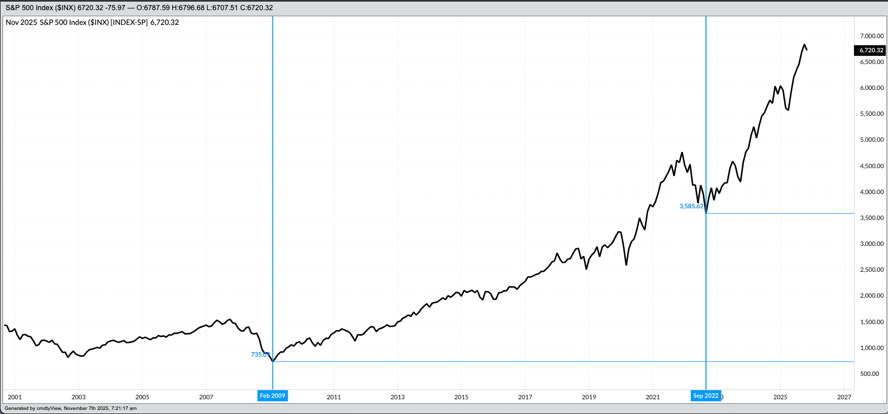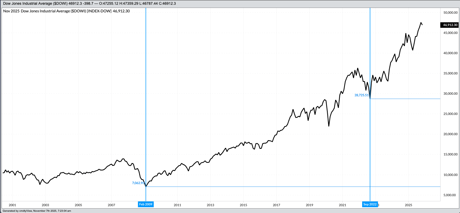 Will US stock indexes ever go down again? And when I say “down”, I mean more than a day or two as we’ve seen since the latest bull run began back in the fall and winter of 2022. (The S&P 500 ($INX) and Dow Jones Industrial Average ($DOWI) both posted low monthly closes at the conclusion of September 2022, with the Nasdaq ($NASX) trailing at December 2022. This was an oddity, as the Nasdaq has led the other major indexes for a number of years.) At the end of October 2025, the three major US indexes were on a string of higher monthly closes: