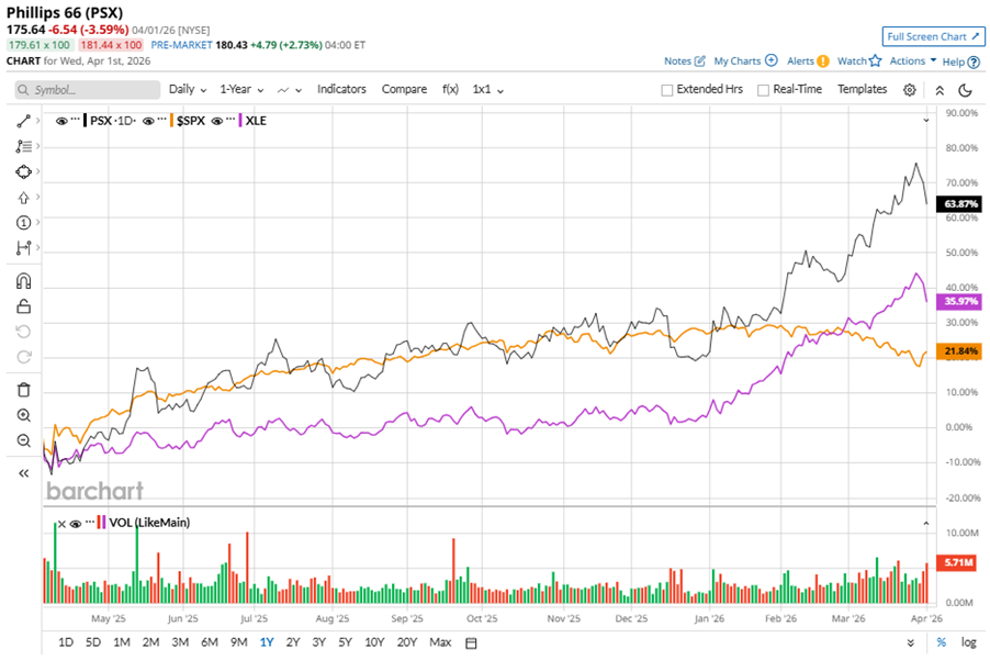 PSX's strong performance is driven by its ability to handle discounted heavy crude amid Middle East tensions, benefiting from lower feedstock costs and higher refined product prices. U.S. refiners like PSX can access cheaper regional crude, boosting margins.