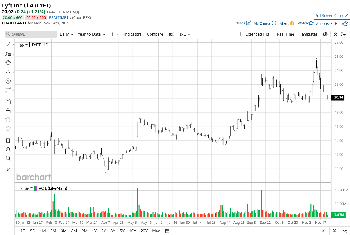 Lyft, headquartered in San Francisco, is one of the biggest ride-sharing platforms in North America and is accompanied by other related offerings like ride sharing, premium ride services like chauffeur rides, and autonomous vehicles. The firm is part of the consumer mobility services and transport technology space and had seen its market cap recover in 2025.