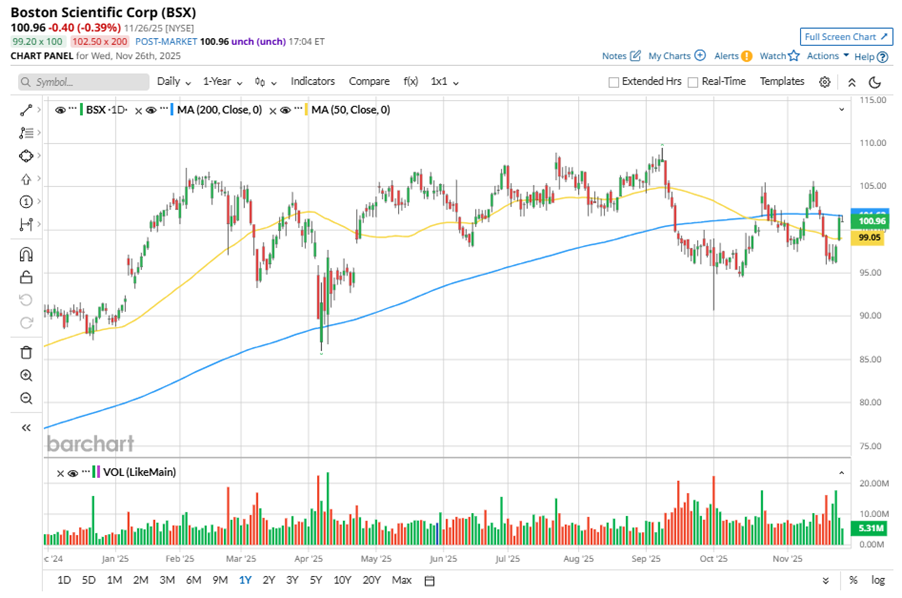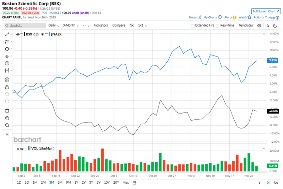Despite its notable strength, BSX slipped 7.8% from its 52-week high of $109.50, achieved on Sep. 9. Over the past three months, BSX stock declined 5.1%, underperforming the Nasdaq Composite’s ($NASX) 7.8% gains during the same time frame.