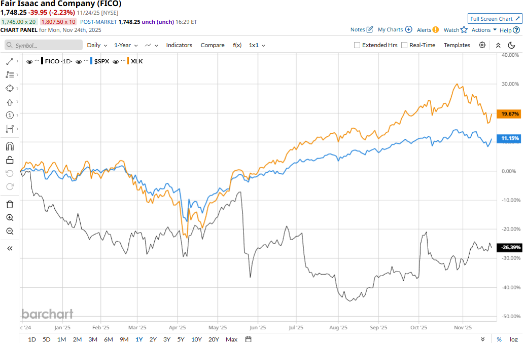 Fair Isaac has significantly underperformed the broader market over the past year. FICO stock prices have plummeted 25.8% over the past 52 weeks and 12.2% on a YTD basis, compared to the S&P 500 Index’s ($SPX) 12% returns over the past year and 14% surge in 2025.