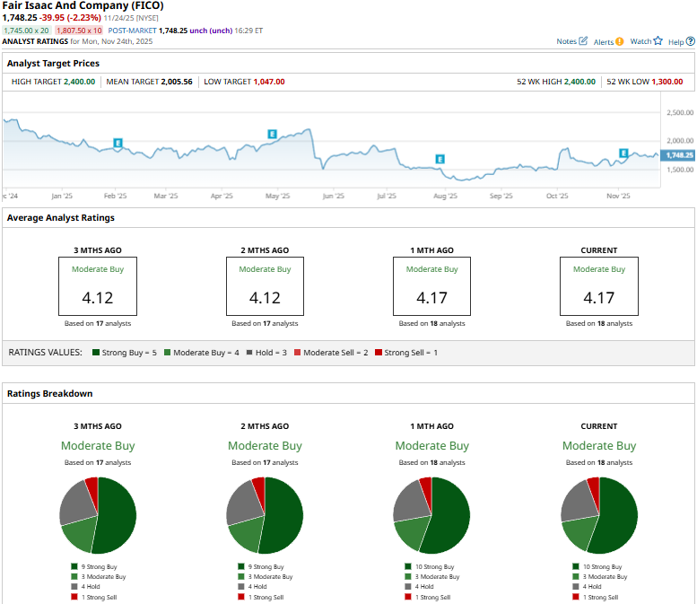 Among the 18 analysts covering the FICO stock, the consensus rating is a “Moderate Buy.” That’s based on 10 “Strong Buys,” three “Moderate Buys,” four “Holds,” and one “Strong Sell.”