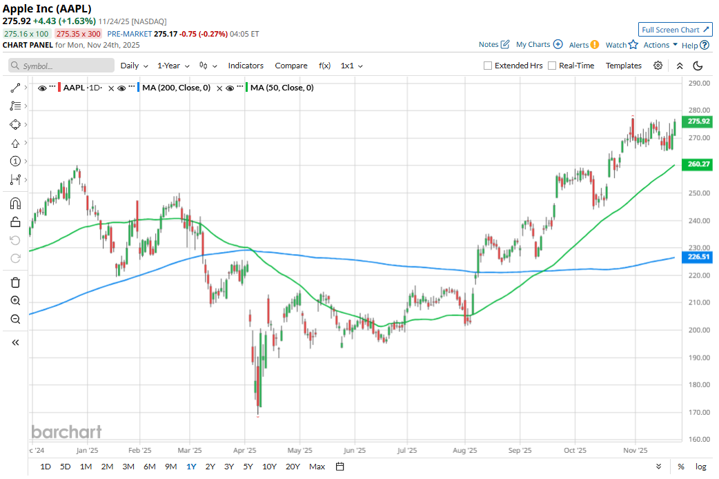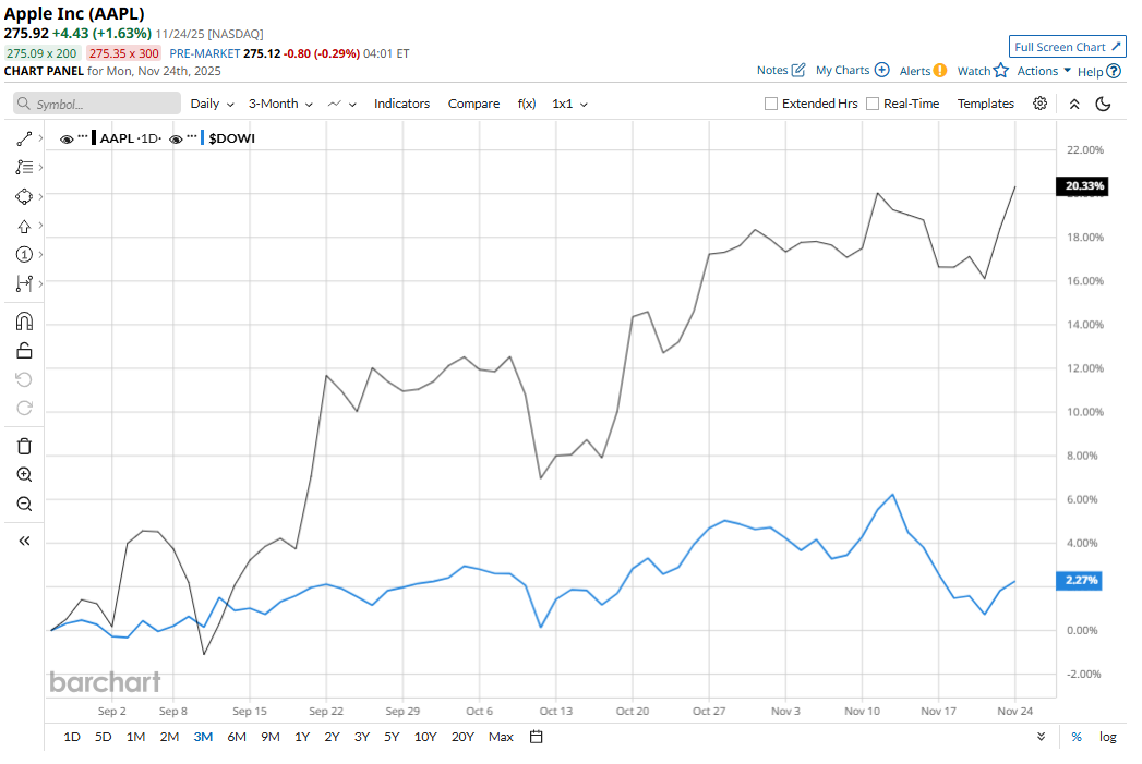Apple is down marginally from its 52-week high of $277.32, achieved on Oct. 31. Over the past three months, AAPL stock gained 21.2%, outperforming the Dow Jones Industrials Average’s ($DOWI) 2.3% gains during the same time frame.