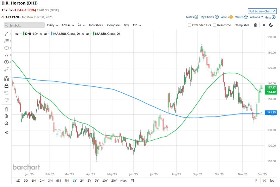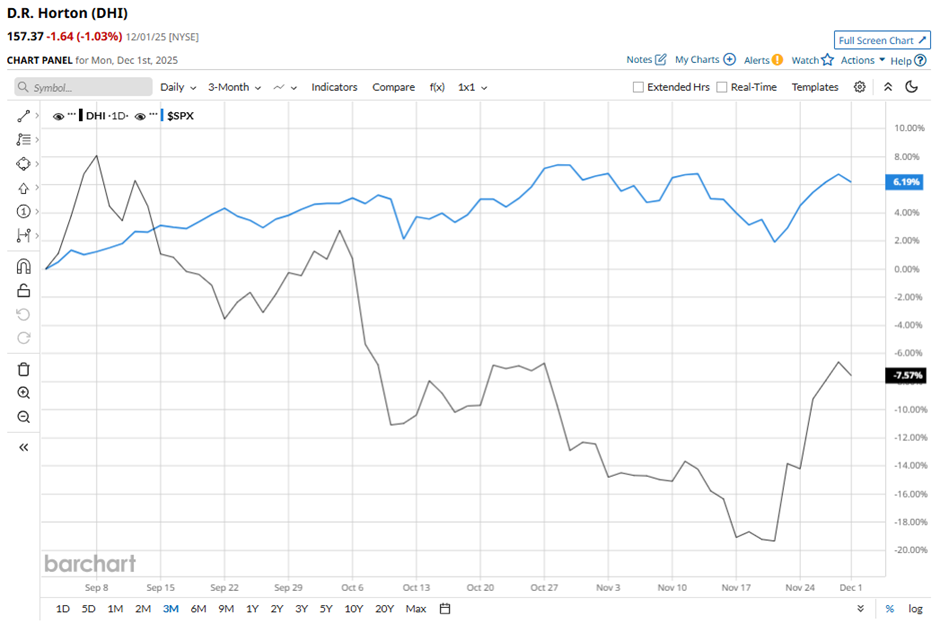 However, the homebuilder stock has fallen 14.7% from its 52-week high of $184.54, achieved on Sept. 8. Shares of DHI declined 7.2% over the past three months, lagging behind the broader S&P 500 Index’s ($SPX) 5.5% increase during the same time frame.