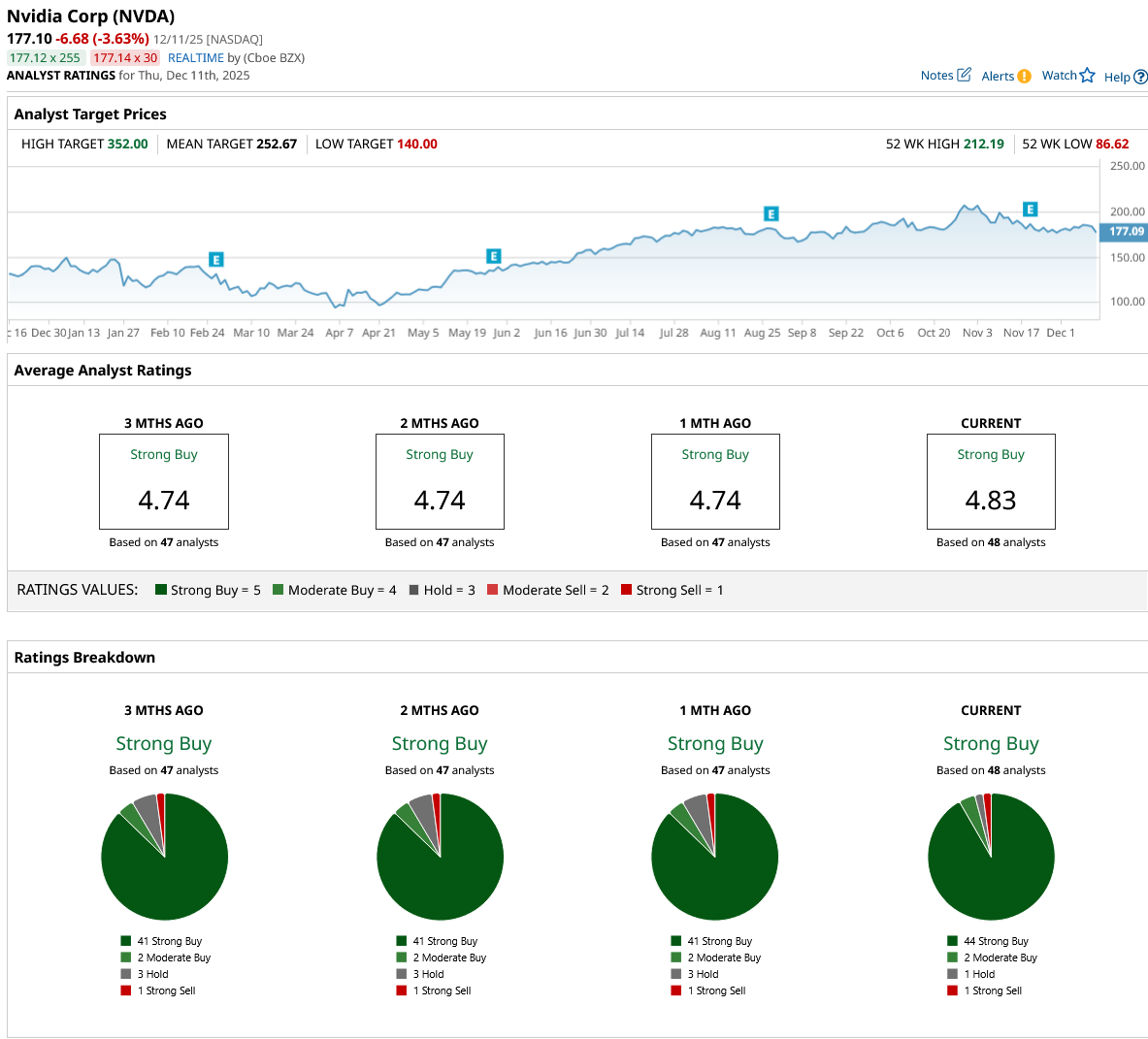 Nvidia’s stock has a top-tier consensus rating of “Strong Buy.” Of the 48 analysts covering the stock, 44 assign a “Strong Buy” rating, two rate it a “Moderate Buy,” one recommends holding, and one issues a “Strong Sell” rating. The mean price target for NVDA stock stands at $252.67, indicating a potential upside of 43% from current levels.