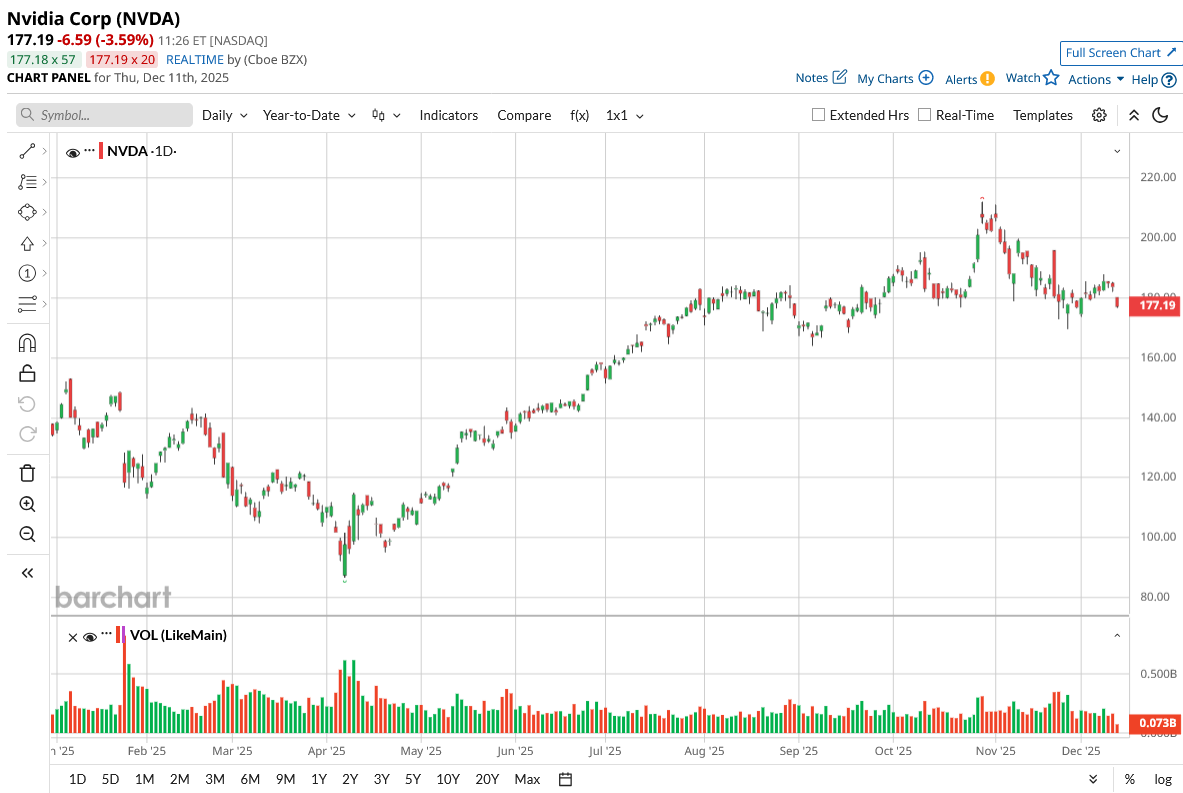Shares of the AI darling have gained 32% on a year-to-date (YTD) basis. NVDA stock continues to consolidate just above the key $180 support level. Earlier this week, President Trump said he would allow the company to export its H200 chip to approved customers in China and other countries in exchange for a 25% surcharge, but the news didn’t lift the stock.