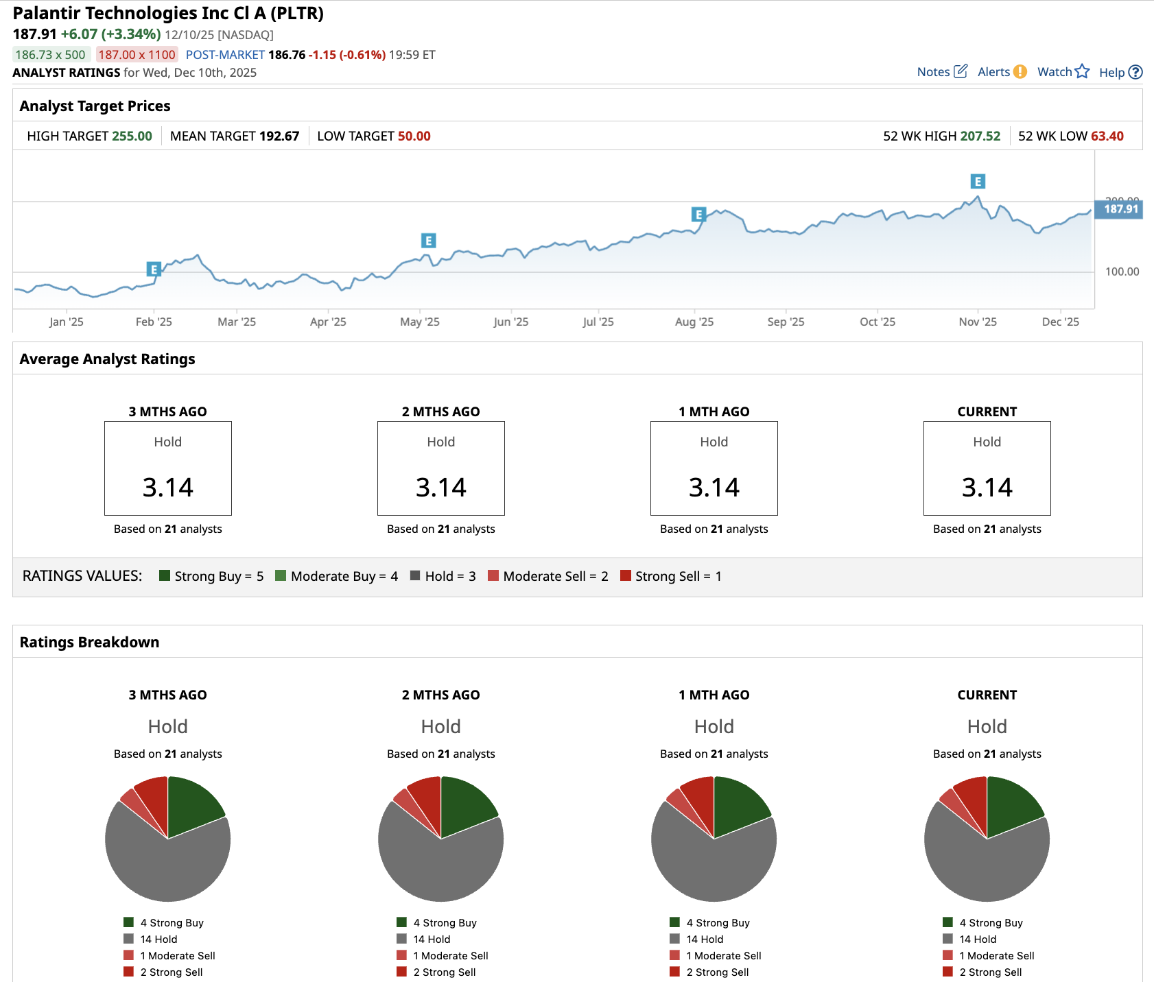 Out of the 21 analysts covering PLTR stock, four recommend “Strong Buy,” 14 recommend “Hold,” one recommends “Moderate Sell,” and two recommend “Strong Sell.” The average Palantir stock price target is $192.67, above the current price of $188.