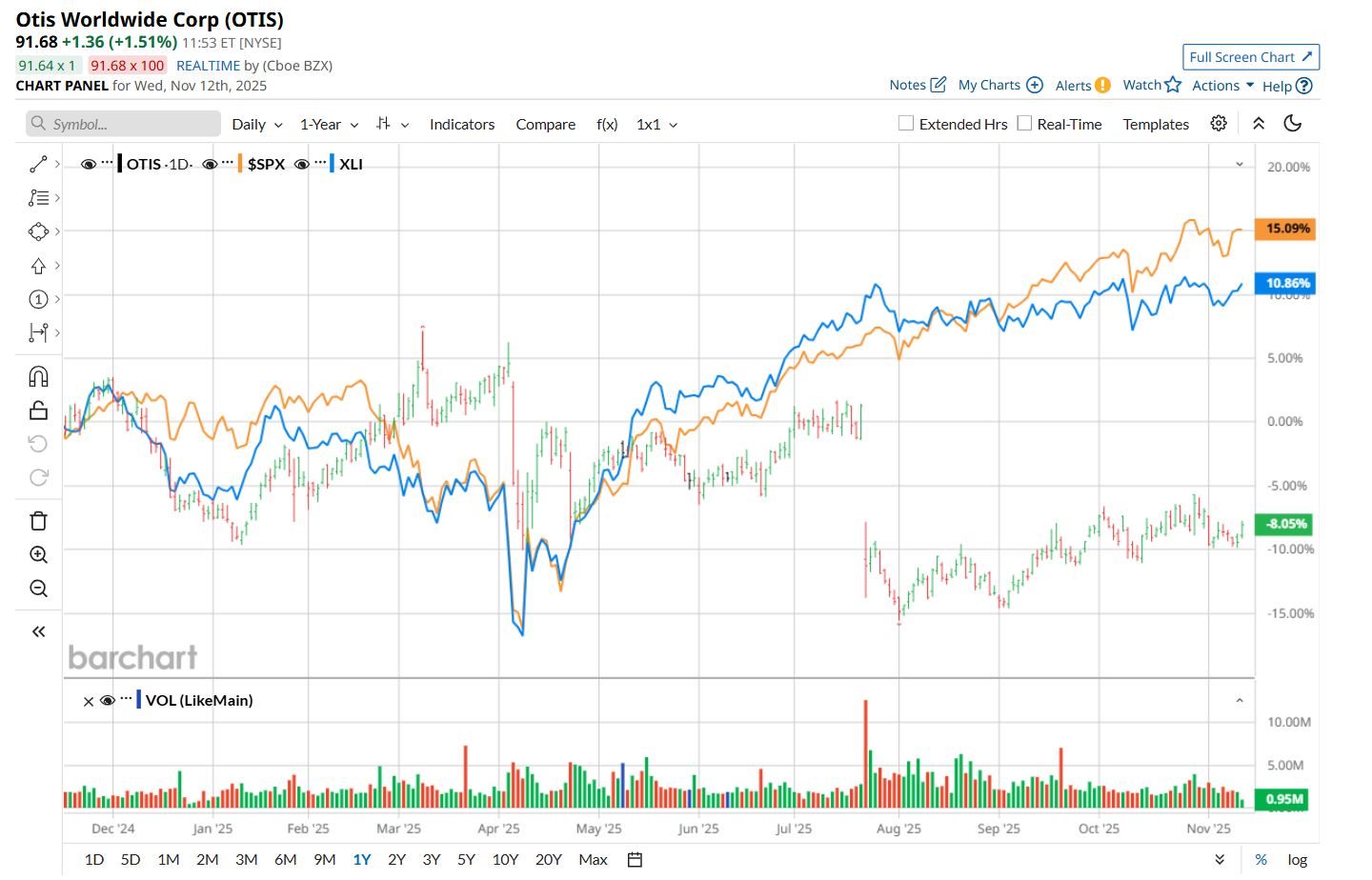 Valued at a market cap of $35.2 billion, Otis Worldwide Corporation (OTIS) is a global leader in manufacturing, installing, and servicing elevators, escalators, and moving walkways. The Farmington, Connecticut-based company's strong service portfolio, including maintenance and modernization offerings, generates stable recurring revenue, while continued investments in innovation and digitalization strengthen its market leadership.