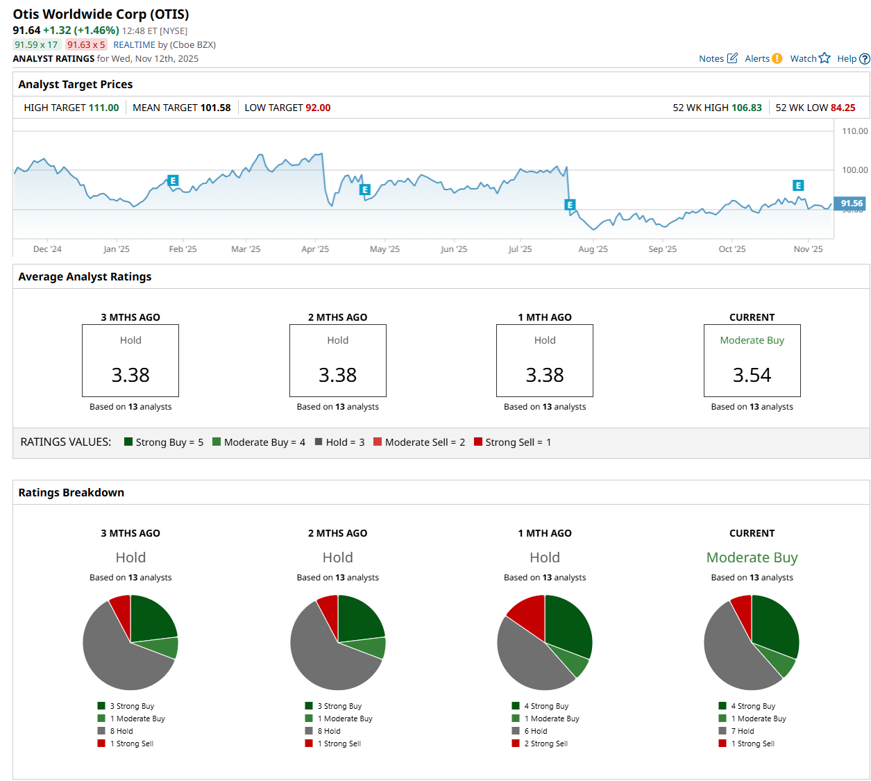 On Nov. 7, Joe O’Dea from Wells Fargo & Company (WFC) maintained a “Hold” rating on OTIS, with a price target of $95, indicating a 3.7% potential upside from the current levels.