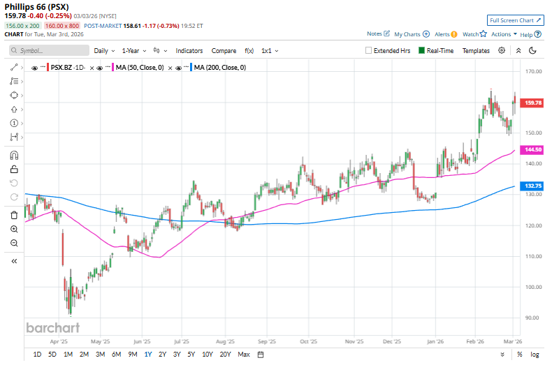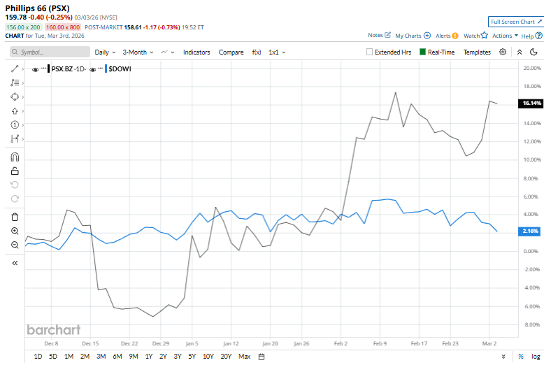 Shares of Phillips 66 climbed more than 3% on Mar. 2 as energy stocks rallied after West Texas Intermediate crude oil (WTI) surged over 6% to an 8.25-month high, boosting sentiment across the oil and refining sector.