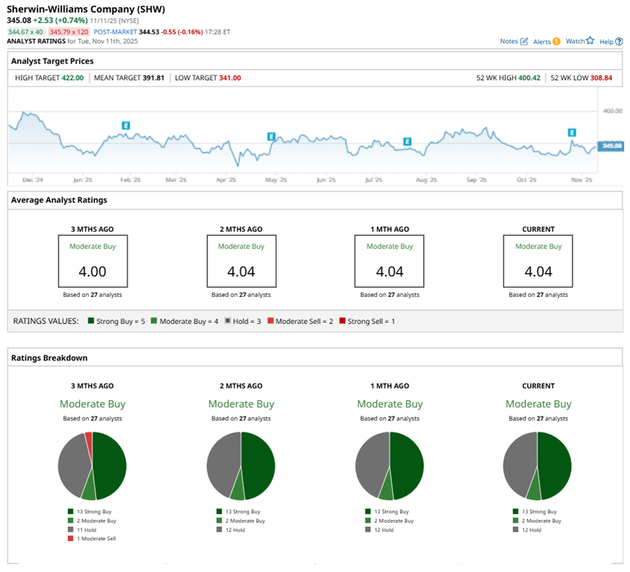 Among the 27 analysts covering SHW stock, the consensus is a “Moderate Buy.” That’s based on 13 “Strong Buy” ratings, two “Moderate Buys,” and 12 “Holds.”