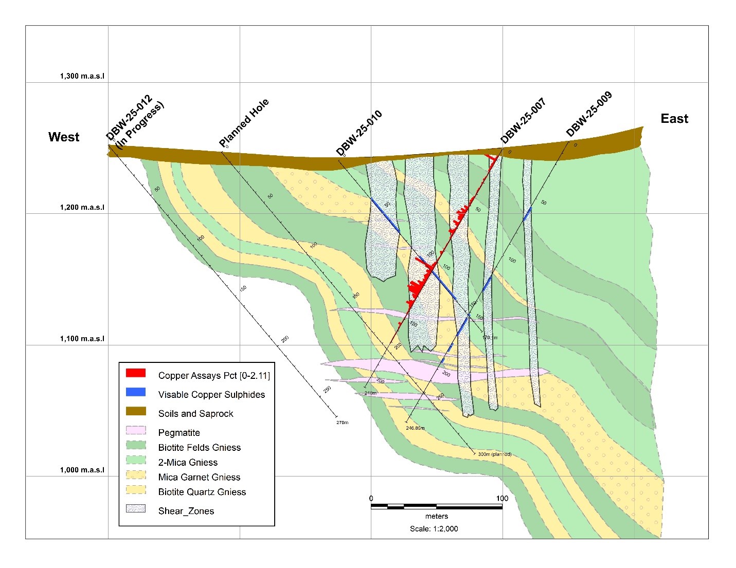 Hole DBW-25-003 intercepted 0.48% Cu over 25.9m and 0.29% Cu over 5.2m in shear zone controlled mineralization.