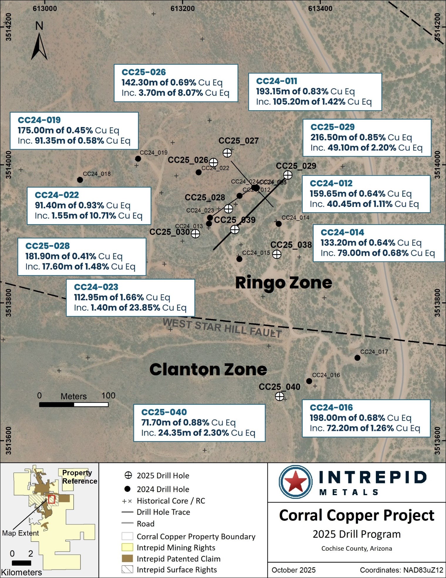Vancouver, British Columbia--(Newsfile Corp. - October 2, 2025) - Intrepid Metals Corp. (TSXV: INTR) (OTCQB: IMTCF) ("Intrepid" or the "Company") is pleased to provide assay results from the new Clanton Zone at the Company's Flagship Corral Copper Property ("Corral" or the "Property") in Cochise County, Arizona. The Company has completed its 2025 drill program at Corral, with a total of twenty-one drill holes (5765.4 meters ("m")) across the Clanton, Ringo, Earp, and Holliday zones. Assay results for the final six drill holes are still pending.