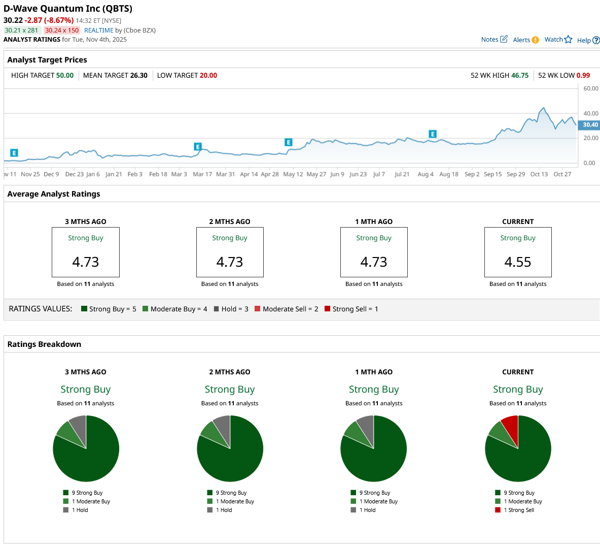 QBTS stock has been rated by 11 analysts with nine “Strong Buy” ratings, one “Moderate Buy” rating, and one “Strong Sell” rating.