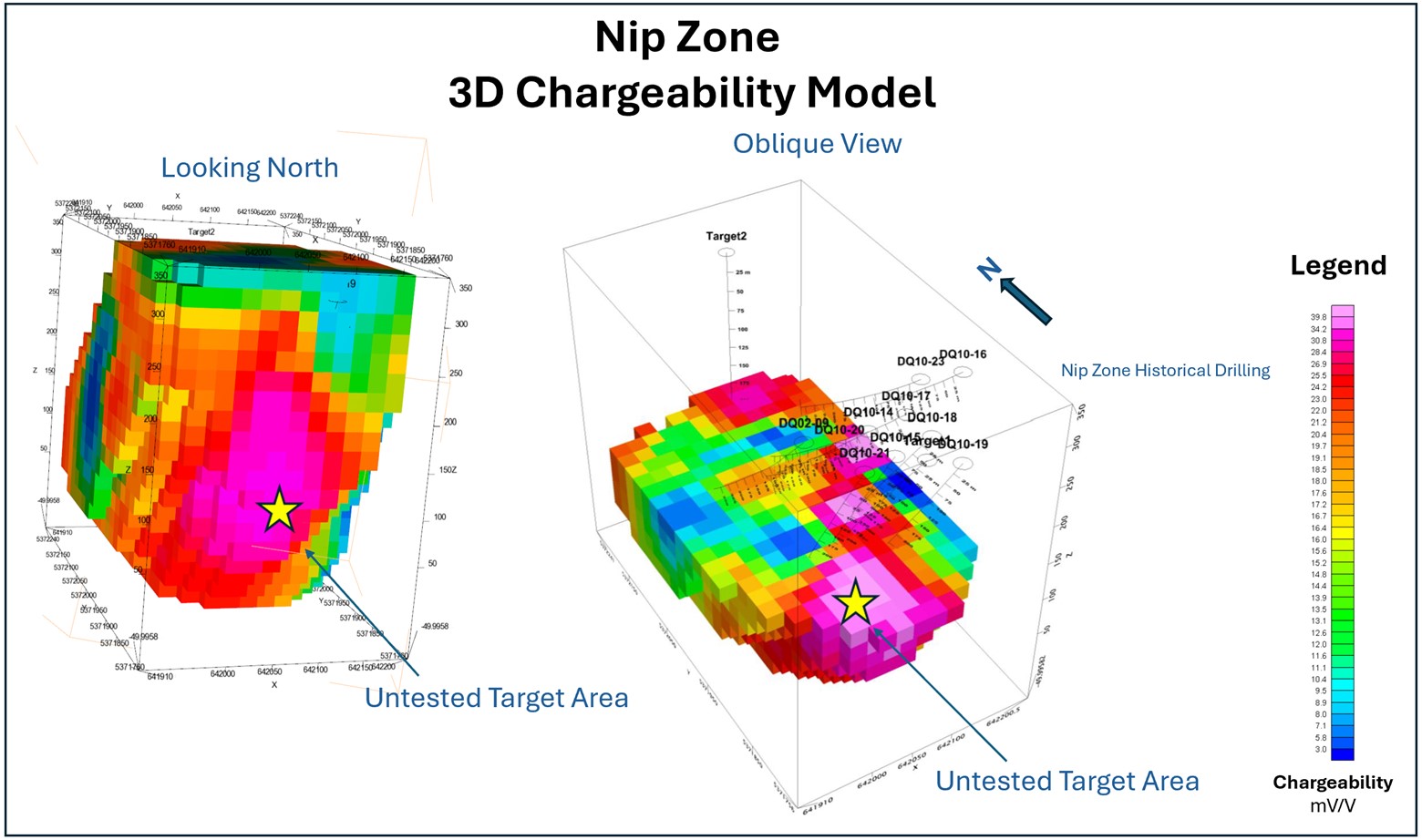Table 1 demonstrates the significant grade and thickness in the Nip Zone.  The intercepts have continuous mineralization in broad zones of structurally brecciated rocks.  These zones of broad high-grade mineralization are associated with IP/Resistivity anomalies forming “hot spots,” as displayed in Figure 2. Some of these hot spots are untested and need follow-up drilling to continue resource building and evaluation.