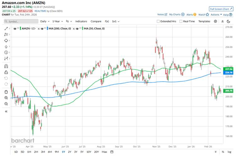 Despite its notable strength, AMZN has slipped 20.4% from its 52-week high of $258.60, achieved on Nov. 3. Over the past three months, the stock declined 9%, underperforming the Dow Jones Industrial Average’s ($DOWI) 5.8% gains during the same time frame.