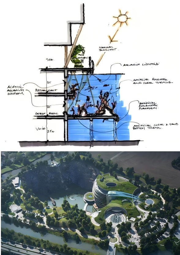 It was essential to take the inspiration for the building and the massing elements from the quarry and its location in order to make it fit into such unique site. It was then my design philosophy of ‘Sensitive Design’ that led me intuitively to the solution of the concept of Green hill/Rocky terraces and Waterfall using a quick abstract hand drawn sketch. This concept needed to be expressed symbolically by the building’s massing, which could not overwhelm the volume of the quarry and by its elements such as the 2 storey ‘green hill’ containing the public areas above the quarry ground level, concave and convex guest wings and the undulating glass ‘waterfall’ lift core. Being such optimist I do not think any of the challenges the project presented kept me awake at night, however there were plenty to overcome.